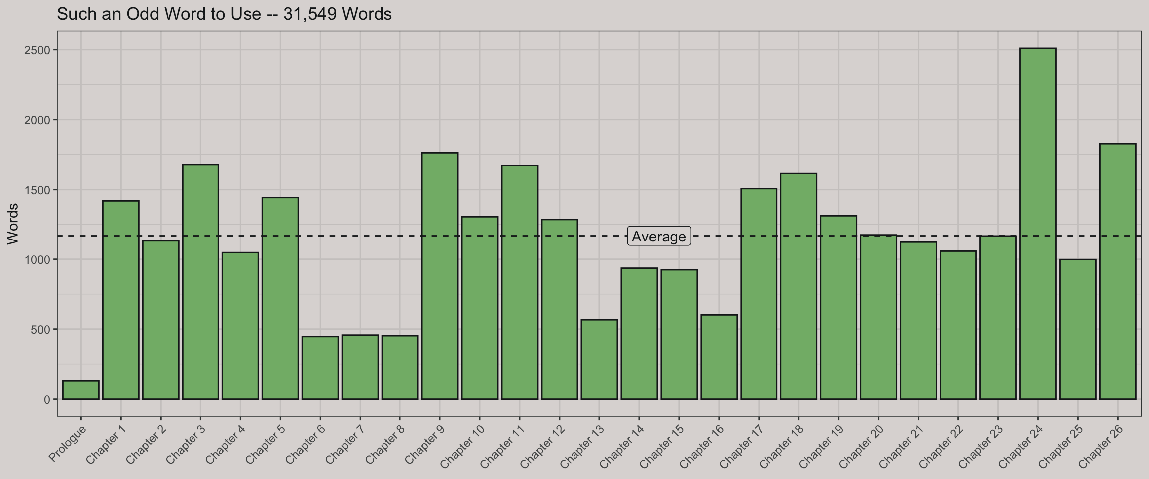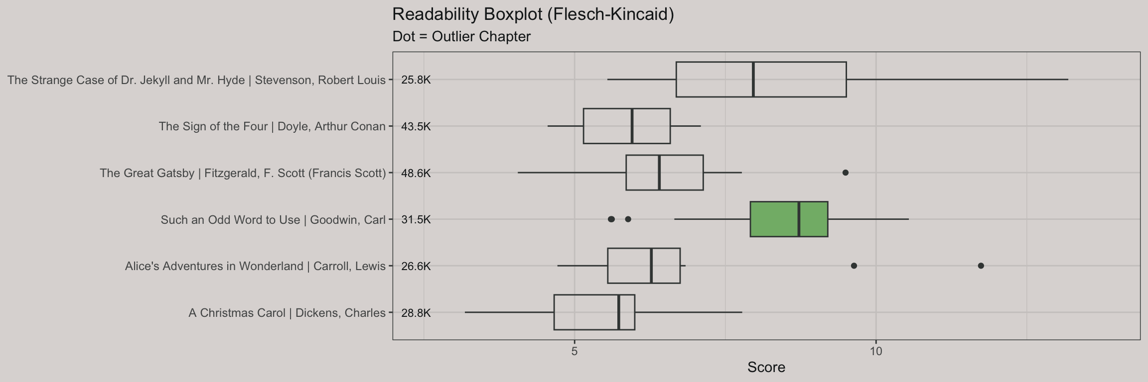 For comparison, I drew on works from Project Gutenberg, a digital library of public domain classics. Selecting works of a similar length, and after stripping out introductory front matter, I computed the same chapter-level readability and word counts for each title. This allowed a side-by-side view of how Such an Odd Word to Use sits in relation to the established canon—not just in overall difficulty, but in how that difficulty shifts over the course of the narrative.