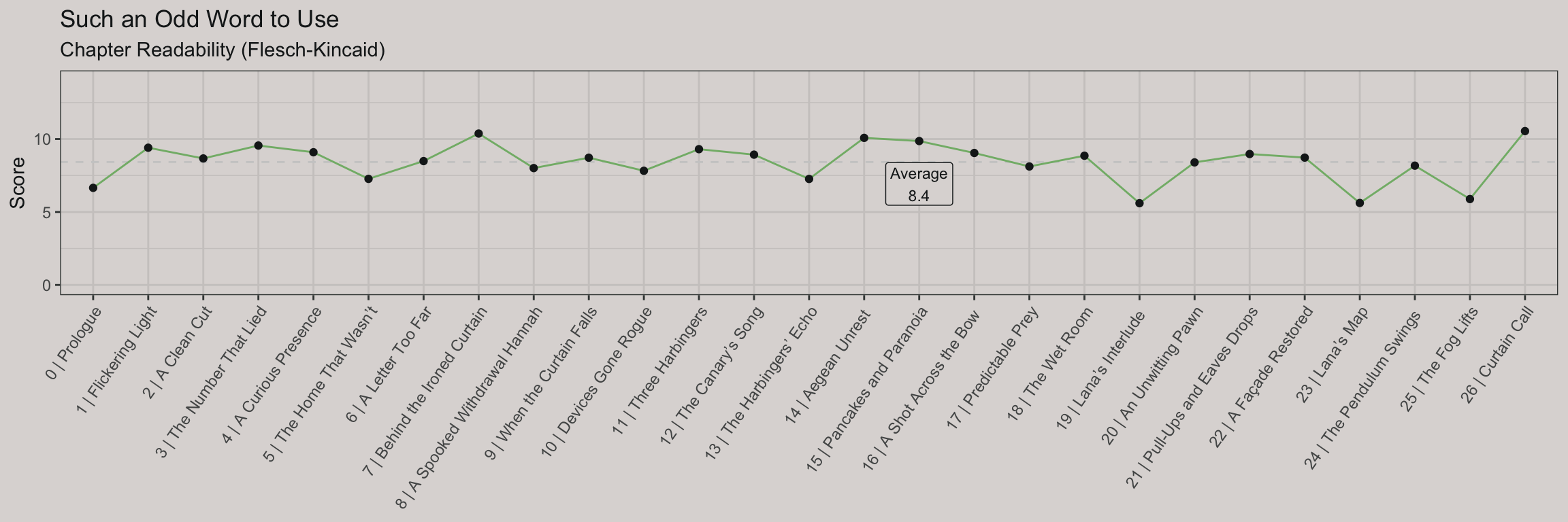 To explore how Such an Odd Word to Use compares to classic literature in style and complexity, I analysed its readability using the Flesch-Kincaid grade level—an estimate of the US school year required to understand a given text. This metric was calculated chapter by chapter, revealing how the reading complexity varies across the book.