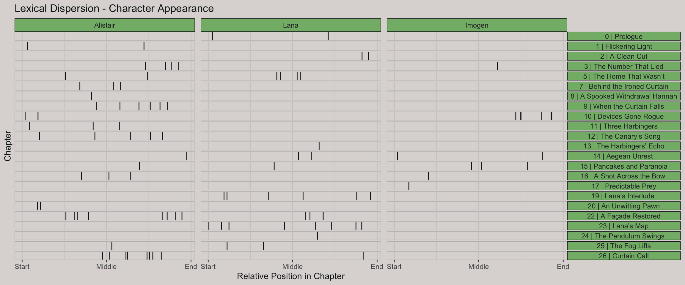 A lexical dispersion plot visualises where and how often key characters are mentioned across the chapters. It highlights patterns in their narrative presence — for example, Alistair (the antagonist) appears consistently throughout, suggesting a sustained influence on the storyline. Lana (an ally) is introduced early but becomes more prominent in later chapters. Imogen (a supporting character) is mentioned more sparingly, reflecting her secondary role in the narrative arc.